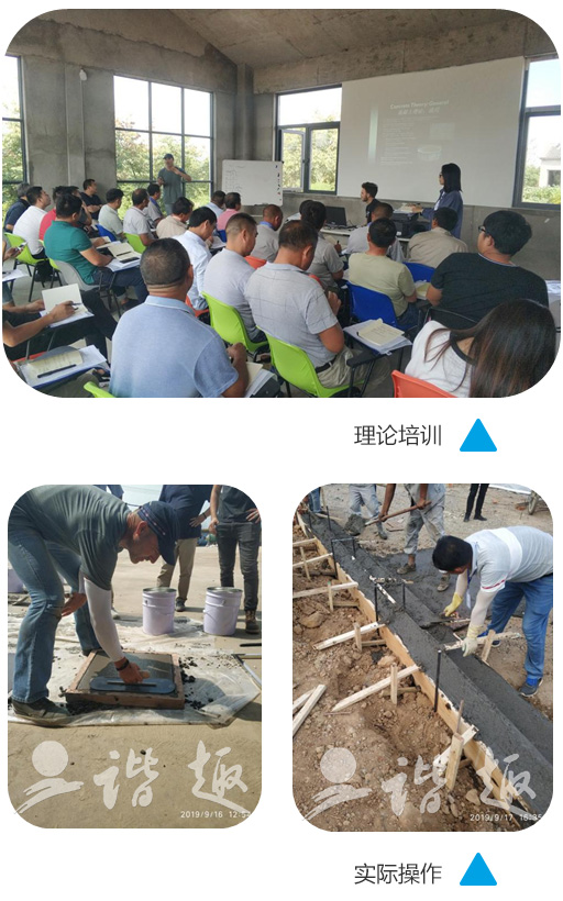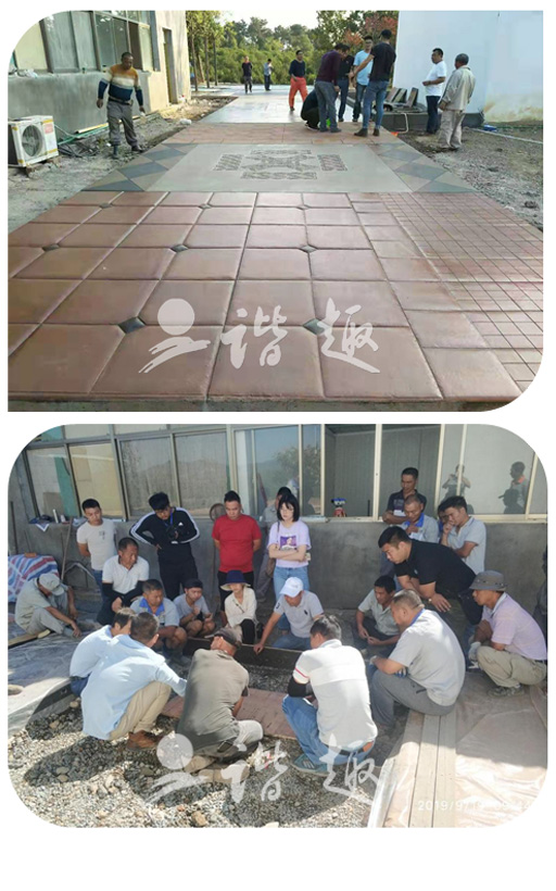 培訓(xùn)采用理論結(jié)合實(shí)際的方法逐步推進(jìn)。理論培訓(xùn)讓所有參加培訓(xùn)的人員了解熟悉彩色混凝土的科學(xué)原理。從最根本的方面了解,這樣可以讓人知其然也可知其所以然,更好的提高施工技術(shù)?,F(xiàn)場(chǎng)實(shí)際操作讓處于一線施工現(xiàn)場(chǎng)的員工了解更多的施工技術(shù),施工方法。改掉以前的一些不正確,效率不高的施工方法。從而達(dá)到更高的施工技藝,為以后的客戶提供更加優(yōu)質(zhì)的服務(wù)。
